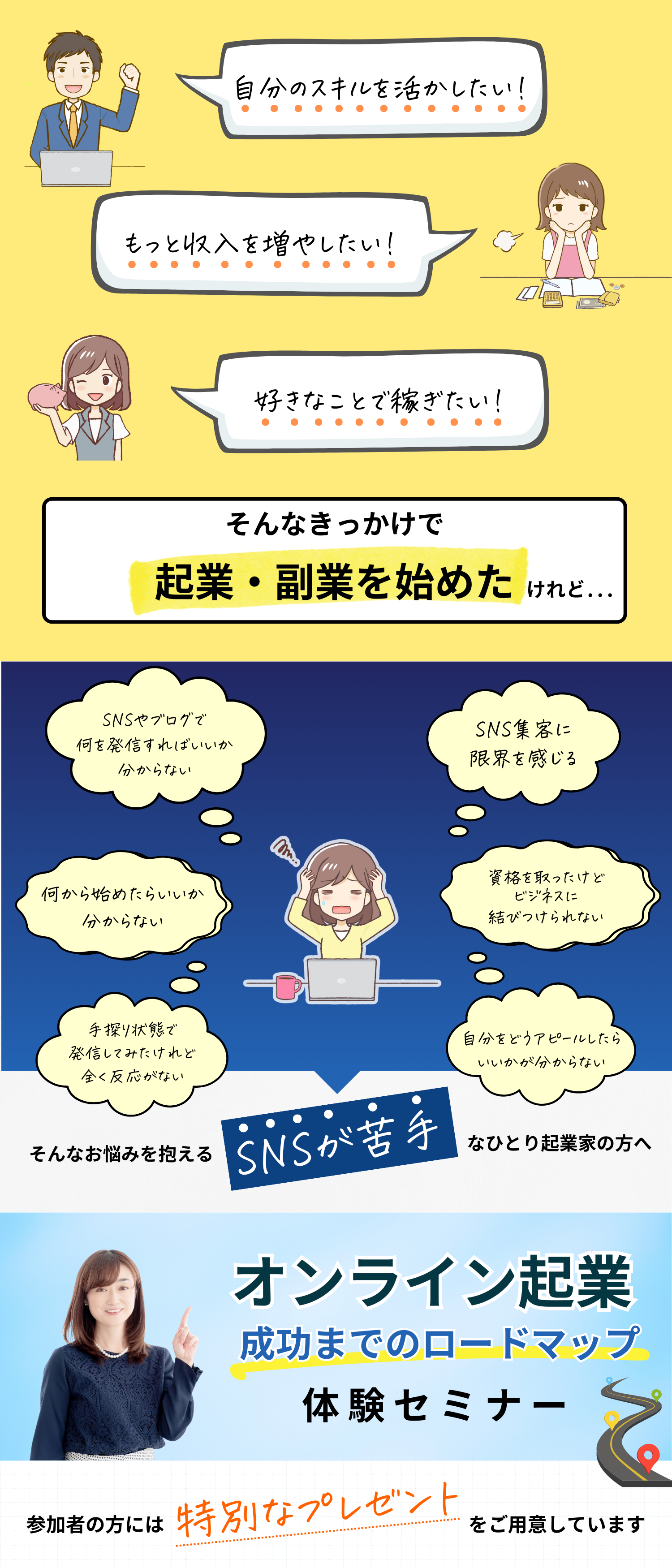 オンライン起業成功までのロードマップセミナーは、6ヶ月のオンライン起業講座【WEBで売れるビジネスをつくるひとり起業プログラム】をギュっと凝縮させた内容となっています。